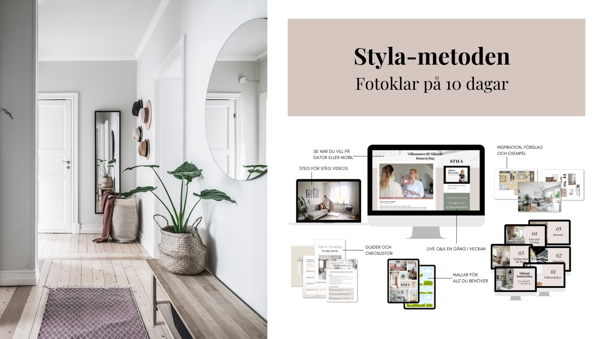 Du följer ett tydligt upplägg som steg för steg visar exakt hur du förbereder, stylar och färdigställer ditt hem inför fotografering och visning – med stöd och personlig feedback längs vägen.